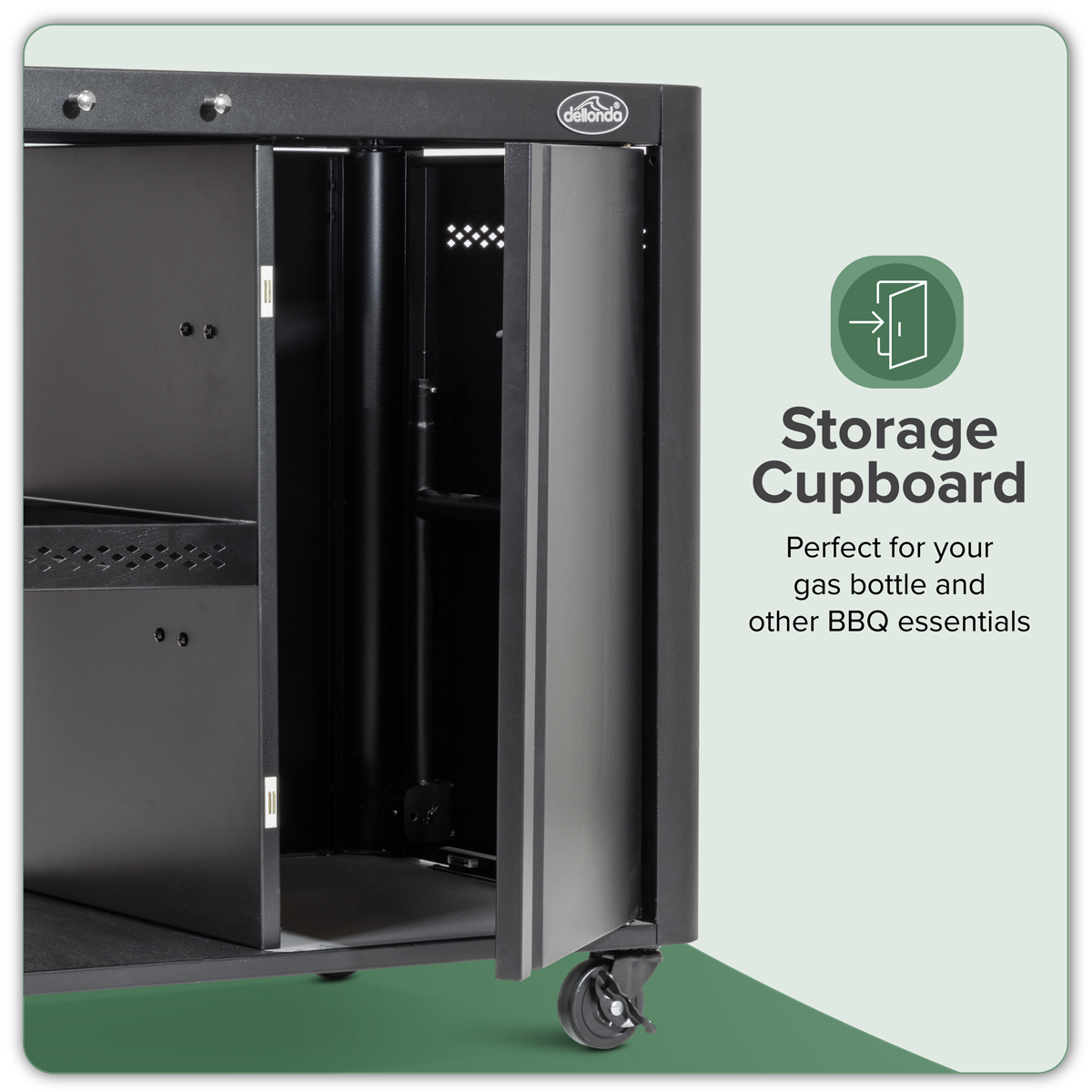 Dellonda BBQ/Plancha Workstation Trolley with Cupboard, Extension Table & Utensil Hooks, Black DG282