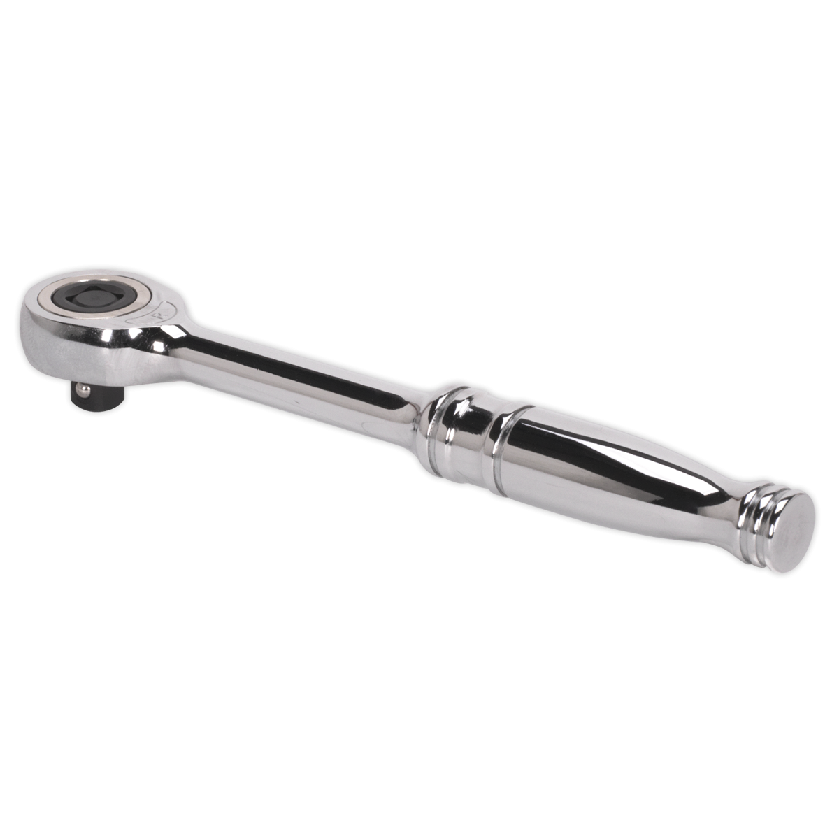 Chrome Vanadium steel ratchet wrench. Hardened and tempered with a fully polished mirror finish. Super smooth gearless ratchet with slim style contoured handle and pear-head design. Features include push-through reverse and silent action.