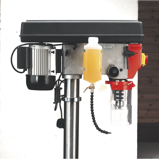 One of a comprehensive range of Premier floor standing pillar drills for the professional workshop. Features heavy-duty aluminium-bodied motor for long and reliable performance. No-volt release switch to prevent inadvertent start-up and pulley cover protected by microswitch to prevent drill operating when cover is open. Fitted with an integral work light which illuminates the drilling table giving operator a clear view of the drilling process (bulb not included). Electrically inter-locked chuck guard. Large sized square table fitted with precision rack and pinion height adjustment.