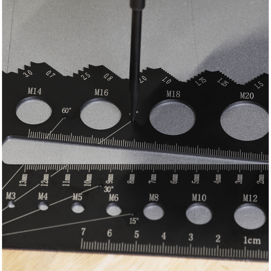 Pocket-size 4-piece Metric Taper Gauge. Precision engineered tool for measuring gaps and hole diameters. Laser cut from stainless steel. Measuring range of 1-8mm, 8-15mm, 15-22mm and 22-30mm. Features a precision scale for accurate inspections.