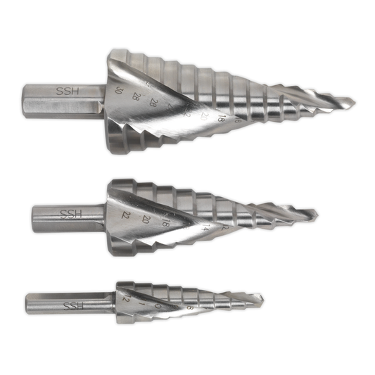Sealey Spiral Flute HSS M2 Step Drill Bit Set 3pc AK4743