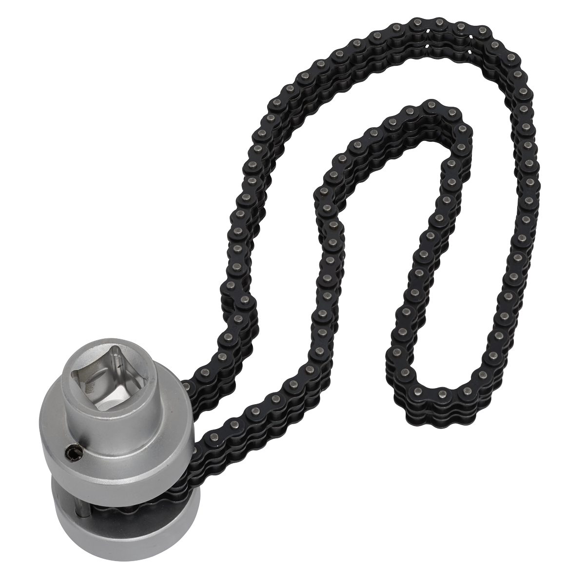 Satin finished carbon steel body with 1/2"Sq drive for use with ratchet wrenches. Heavy-duty thin double chain. Essential tool for removing commercial air brake filters.