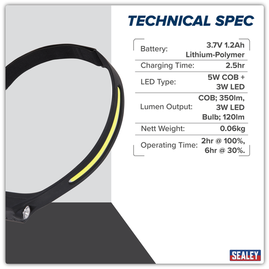 Sealey Rechargeable Head Torch with Auto-Sensor 5W COB & 3W LED HT104R