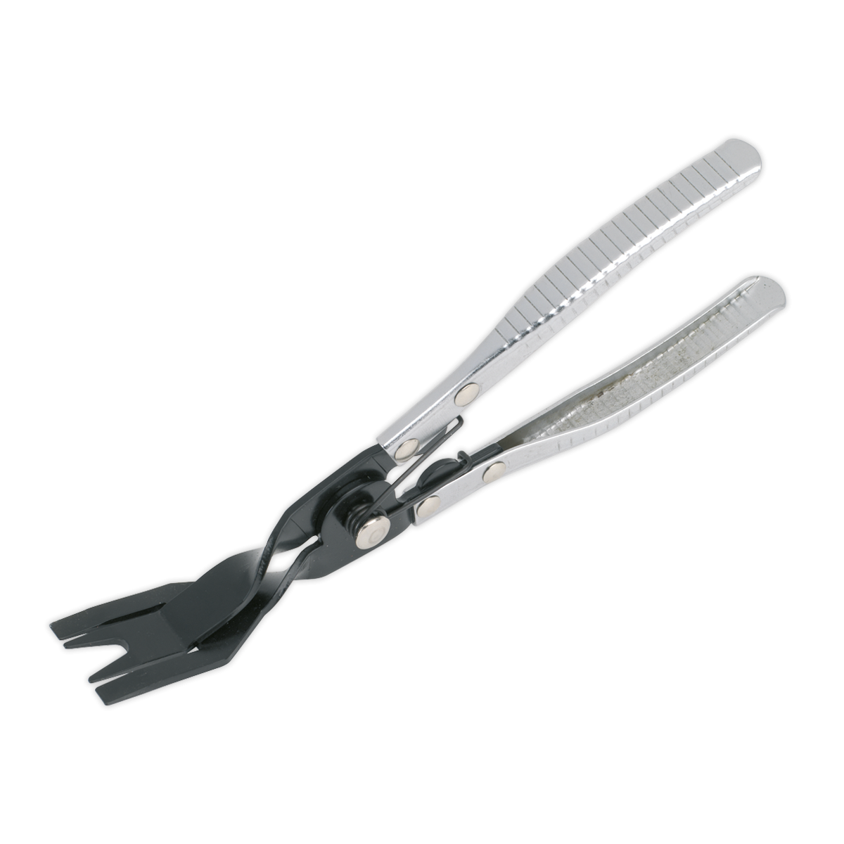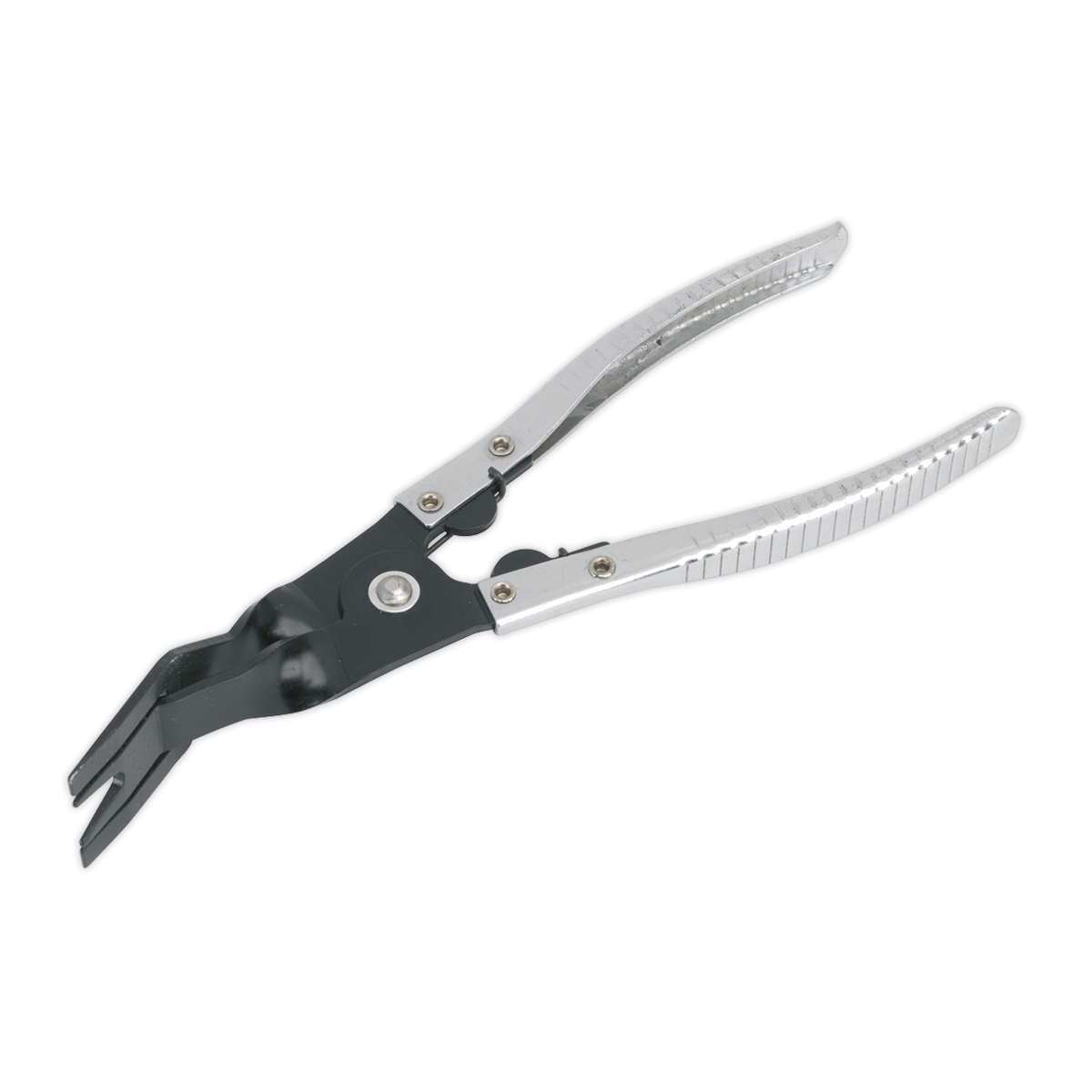 Spring loaded pliers for trim clip removal without trim damage. Easy-access into confined areas, such as bumper covers.