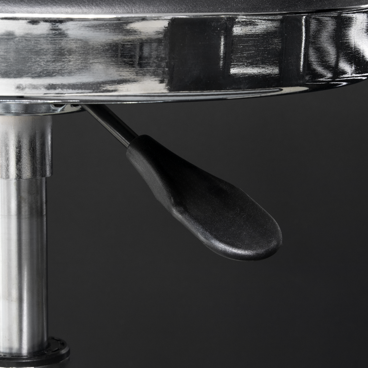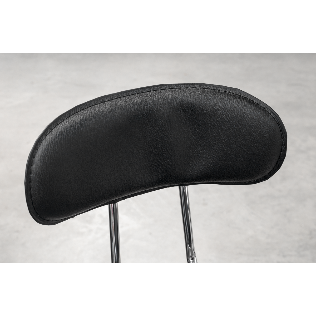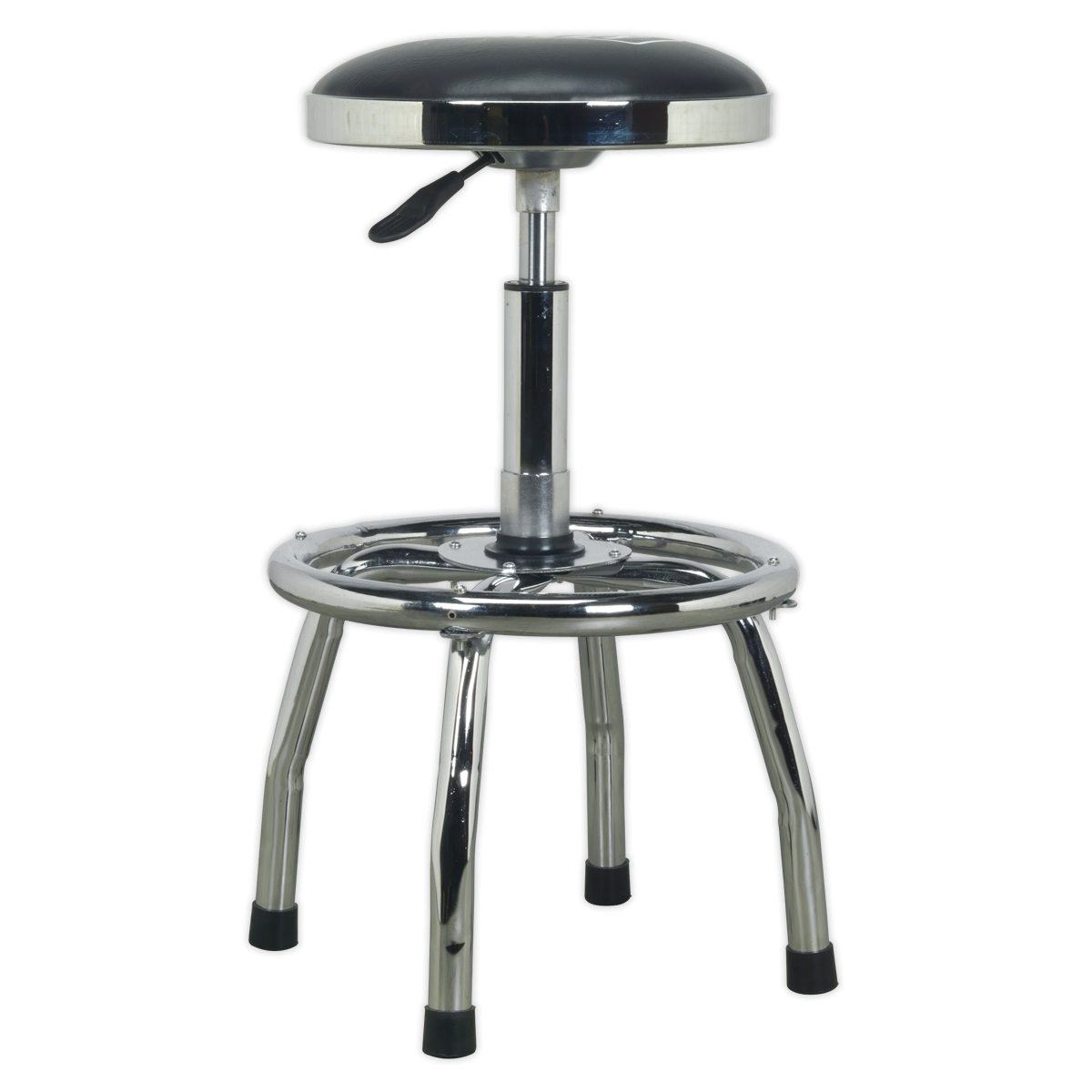 4-Legged heavy-duty steel construction with a polished Chrome plate finish for corrosion resistance. Heavy-duty Ø32mm strengthening ring for stability which also acts as a foot rest. Ø365mm Swivel seat features pneumatic height adjustment (695 to 815mm), rotates fully through 360° and is made from high-density foam with a black PU imitation leather cover for extra comfort and style.