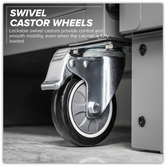 Tough and durable construction with a high gloss powder coated finish. Black anodized aluminium handles and drawer pulls. Drawers fitted with soft close ball-bearing drawer slides. 38mm stainless steel worktop. Gas struts on wall cabinet doors. This item is heavy. Extra assistance must be provided at the delivery point to help its safe delivery.